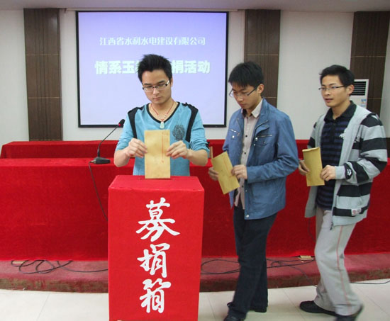 2010年4月14日,青海省玉樹縣發(fā)生兩次地震,最高震級7.1級,造成了當?shù)鼐薮蟮娜松韨龊拓敭a(chǎn)損失,“玉樹地震”牽動著億萬人民的心,也牽動著我司所有員工的心!公司在全司范圍內(nèi)積極開展“情系玉樹募捐活動”,4月26日,我公司南昌市機關總部首先開展了“情系玉樹募捐活動”,公司中層以上管理人員和員工踴躍參與募捐活動,紛紛獻上自己的一份愛心,體現(xiàn)出江西水總人的社會責任感!同時,各分公司、國內(nèi)外施工項目部也在開展此項活動,預計此項活動將募得資金3萬余元。