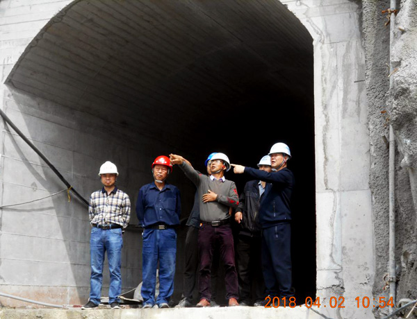 董事長在導流洞出口聽取項目經理匯報工程進展情況