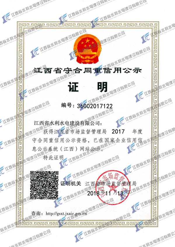 公司榮獲江西省2017年度“守合同重信用”公示資格